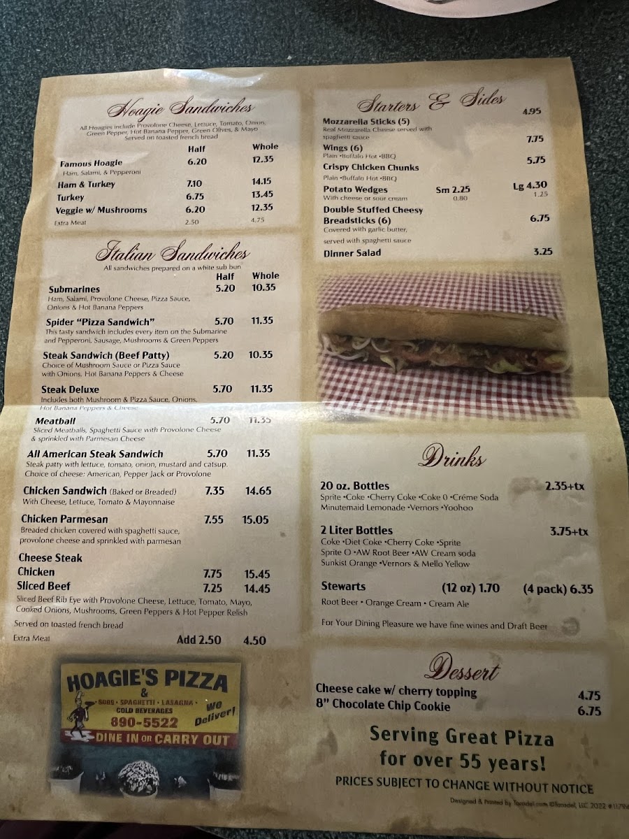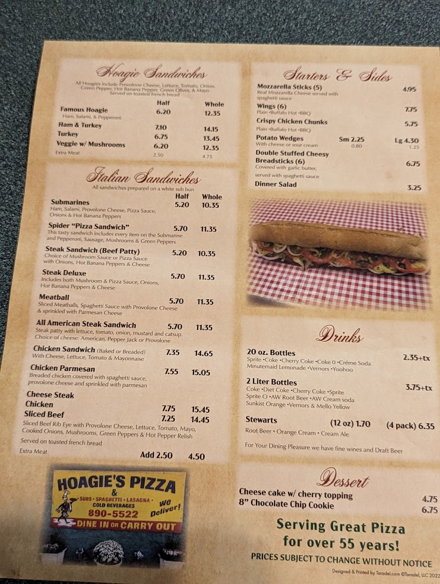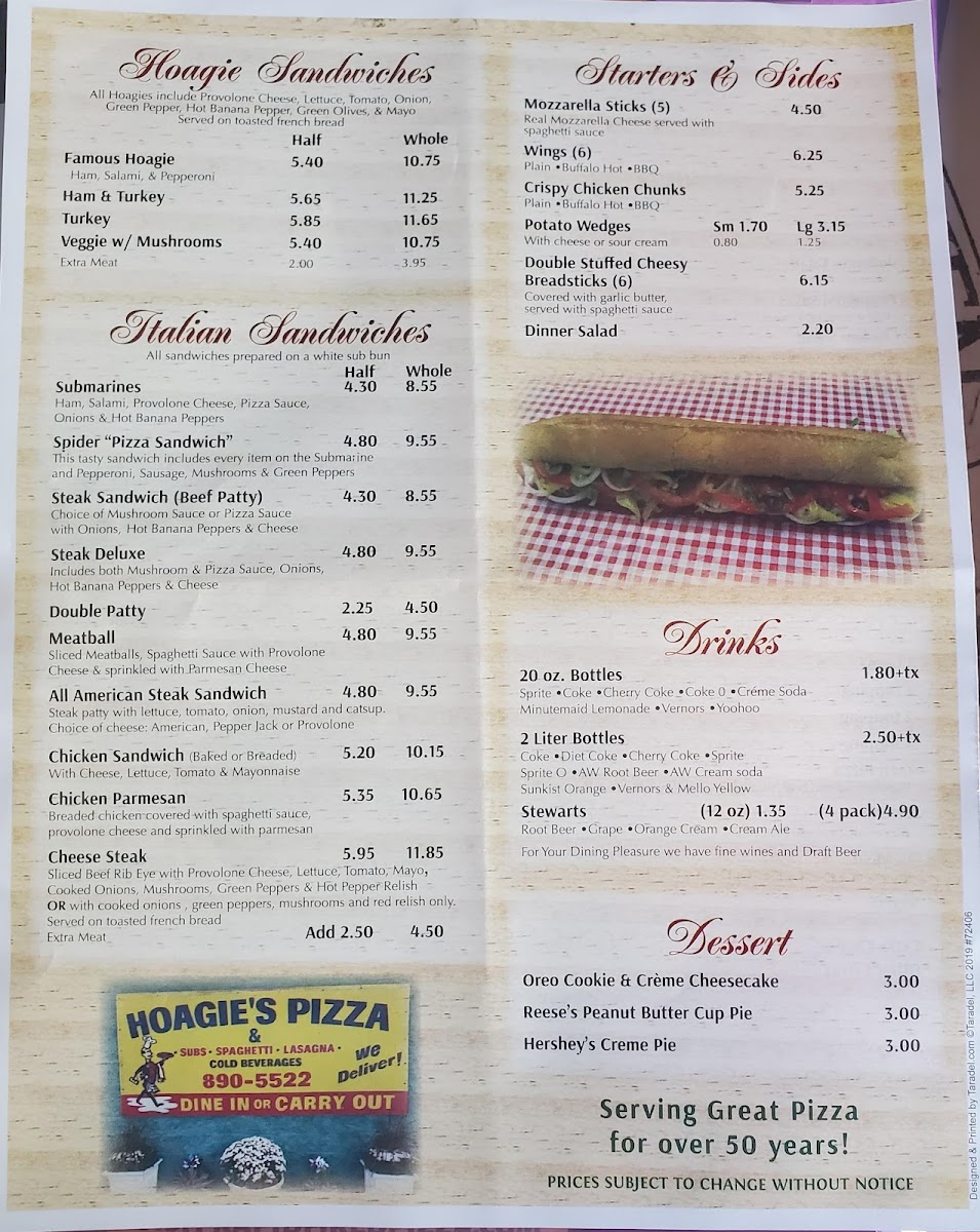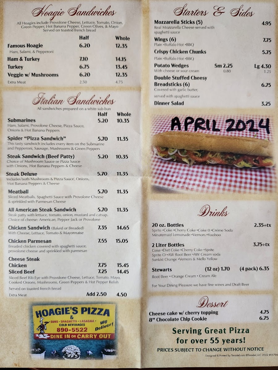 The menu at Hoagie's Pizza House, Inc. offers a straightforward, approachable selection that fits well with its casual and welcoming atmosphere. Here, you can find classic Italian favorites alongside comforting pizza options that invite relaxed meals any time of the day.